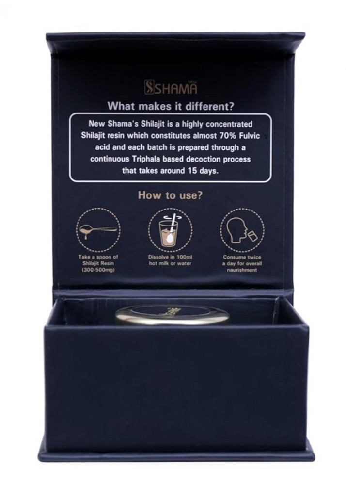 New Shama's Shilajit is a highly concentrated Shilajit resin which constitutes almost 70% Fulvic acid and each batch is prepared through a continuous Triphala based decoction process that takes around 15 days.